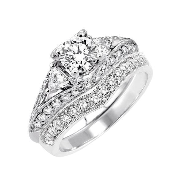 Slip this adorable Diamond Wedding Set on her finger, and express your lasting love for her. Styled in lustrous 14 karat white gold, this wedding set showcases the engagement ring which holds a dazzling 5/8 ct round cut center stone diamond accentuated by 34 sparkling pave and prong set round and trillion cut diamonds that flow down the shank. The wedding band shivers in brilliance with 14 magnificent round cut diamonds in pave setting. Total diamond weight for the set is 1 3/4 ctw.