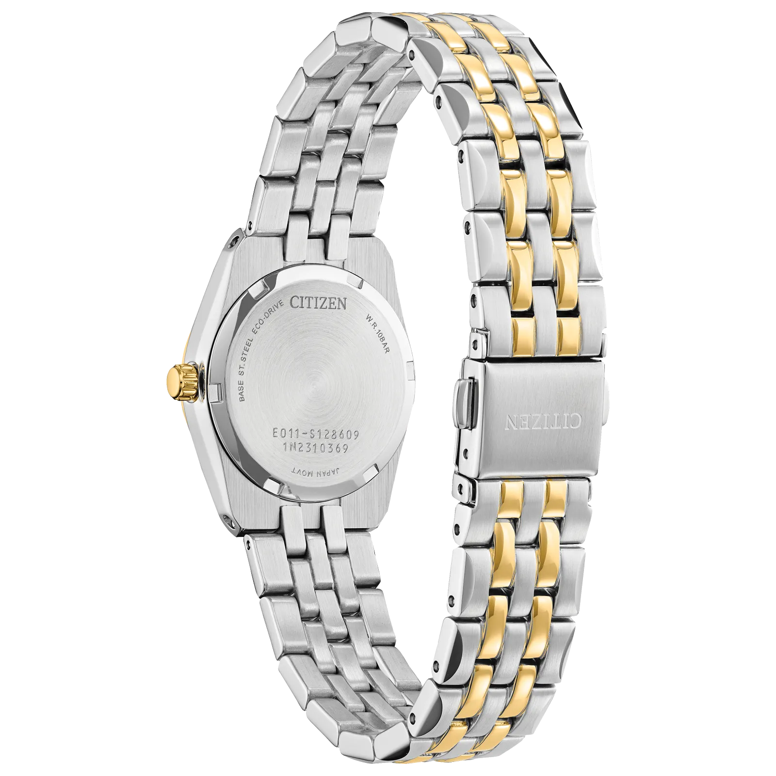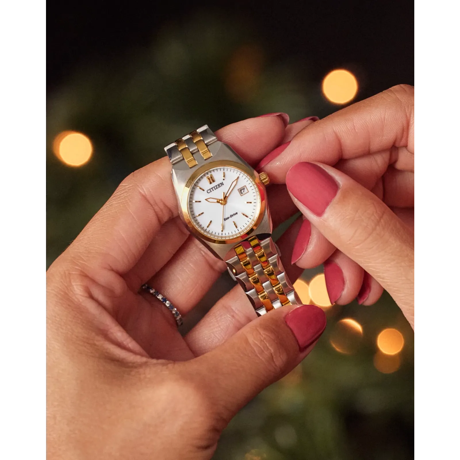 A classic timepiece is always in style in the Corso women’s watch from Citizen. Featuring a two-tone gold and silver-tone stainless steel bracelet and case with...a 3-hand white dial and date indicator, luminous hands and gold-tone markers. This elegant timepiece also features a fold-over clasp closure with hidden push buttons and is water resistant to 100 meters. If you’re looking for a dress watch to add effortless style to your wardrobe, the Corso is the perfect choice. It also uses Citizen’s proprietary Eco-Drive technology, so it is sustainably powered by any light and will never need a battery. Caliber number E011.