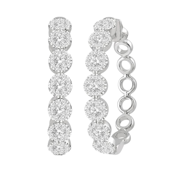 A gorgeous pair of Lovebright diamond hoop earrings, these can make any woman fall in love with them instantly. Each of the earrings feature 14 circular mounts, the front facing 7 of which are embellished with sparkling round cut diamonds. The 7 mounts on each earring is adorned with an invisible set round cut diamond in the center, a total of 14 on both earrings. The center stone is haloed by 8 small invisible set round cut diamonds each, a total of 112 diamonds on both earrings together. Styled in 14 karat white gold, these earrings add panache to any ensemble. Total diamond weight is 1 ctw.