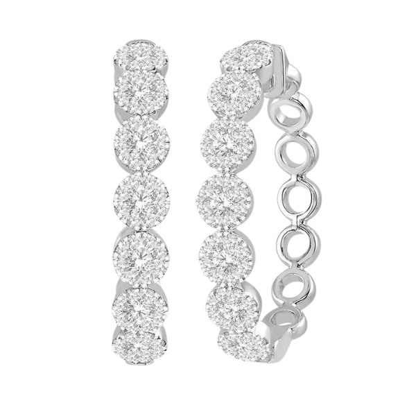 A gorgeous pair of Lovebright diamond hoop earrings, these can make any woman fall in love with them instantly. Each of the earrings feature 14 circular mounts, the front facing 7 of which are embellished with sparkling round cut diamonds. The 7 mounts on each earring is adorned with an invisible set round cut diamond in the center, a total of 14 on both earrings. The center stone is haloed by 8 small invisible set round cut diamonds each, a total of 112 diamonds on both earrings together. Styled in 14 karat white gold, these earrings add panache to any ensemble. Total diamond weight is 1 ctw.