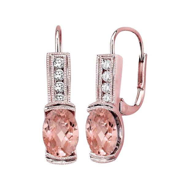 These exquisite 14 karat rose gold milgrain finish Morganite and diamond earrings add shine to your fashion statement. These elegant pair of earrings features oval cut center stone Morganite in channel set, accentuated by 8 elegant round cut diamonds with channel set. Total diamond weight is 1/6 ctw and each Morganite measures 7x5 MM.