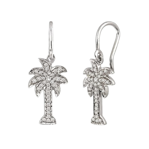 Express the rhythm of new fashion statement with this resplendent Palm Tree diamond earrings showcasing a sunburst of 68 single cut sparkling diamonds in pave set and rendered elegantly on luminous rhodium finish 14 karat white gold. Total diamond weight is 1/4 ctw.