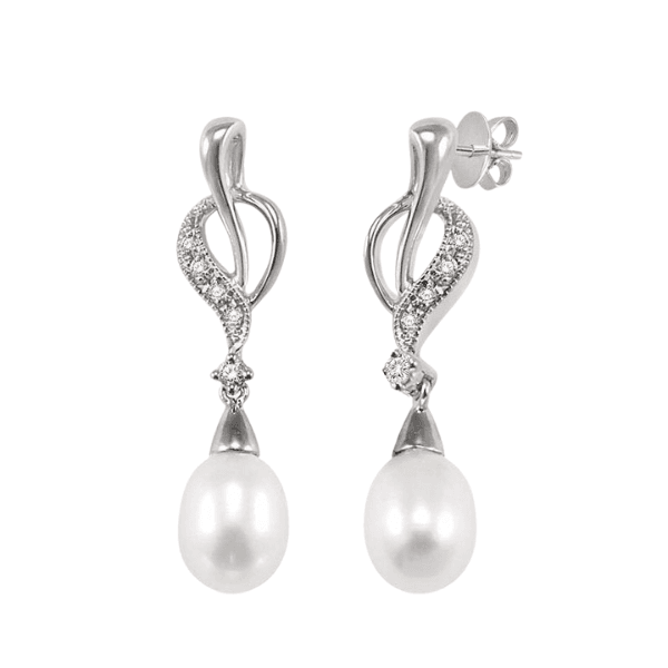 Express your innermost feelings about her with these vibrant milgrain finished Cultured Pearls and Diamond Drop Earrings. Fashioned in radiant 10 karat white gold these dazzling earrings showcases gorgeous drop shape cut Cultured Pearls that are accentuated with 10 resplendent round cut diamonds set in heart motif. Diamonds are beautifully prong set. These earrings are closed with secured clasp. Total diamond weight is 1/10 ctw and each Cultured Pearls measures 8x6MM.