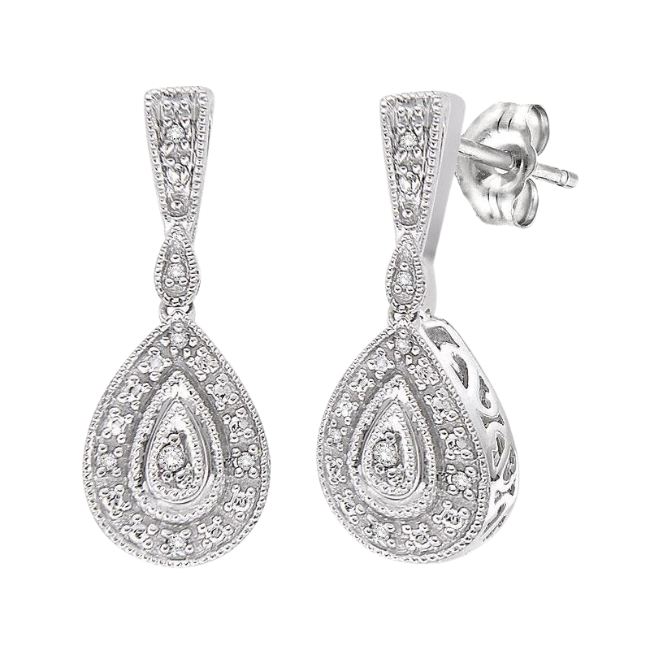 Her radiant appearance will glow with these gleaming milgrain finished diamond earrings. Crafted in smooth sterling silver, these pear shaped designer earrings are encrusted with 14 gorgeous single cut diamonds, beautifully pave set and closed with secured clasp. Total diamond weight is 1/20 ctw.