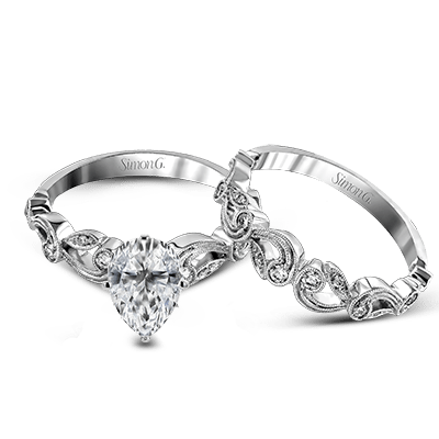 This delicate, floral-inspired wedding set is accentuated with shimmering white diamonds.