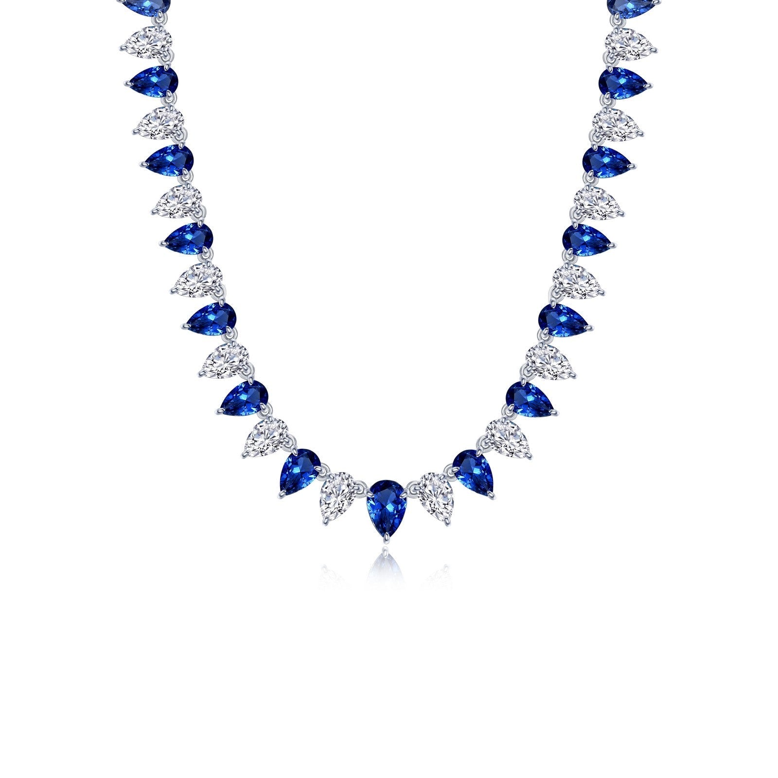 A stunning regal statement. This shimmering alternating tennis choker necklace is set with pear-shaped fancy lab-grown blue sapphires and Lafonn's signature Lassaire graduated simulated diamonds in sterling silver bonded with platinum. Lab-grown sapphires have the exact same chemical, mineral, and optical properties as natural sapphires which vary in color, texture and pattern. We make every effort to keep our lab-grown sapphire stone colors consistent. However, all lab-grown sapphires may not be exactly as shown on the website. Stones may appear lighter, darker or have natural variations.