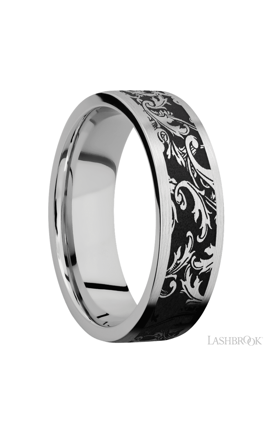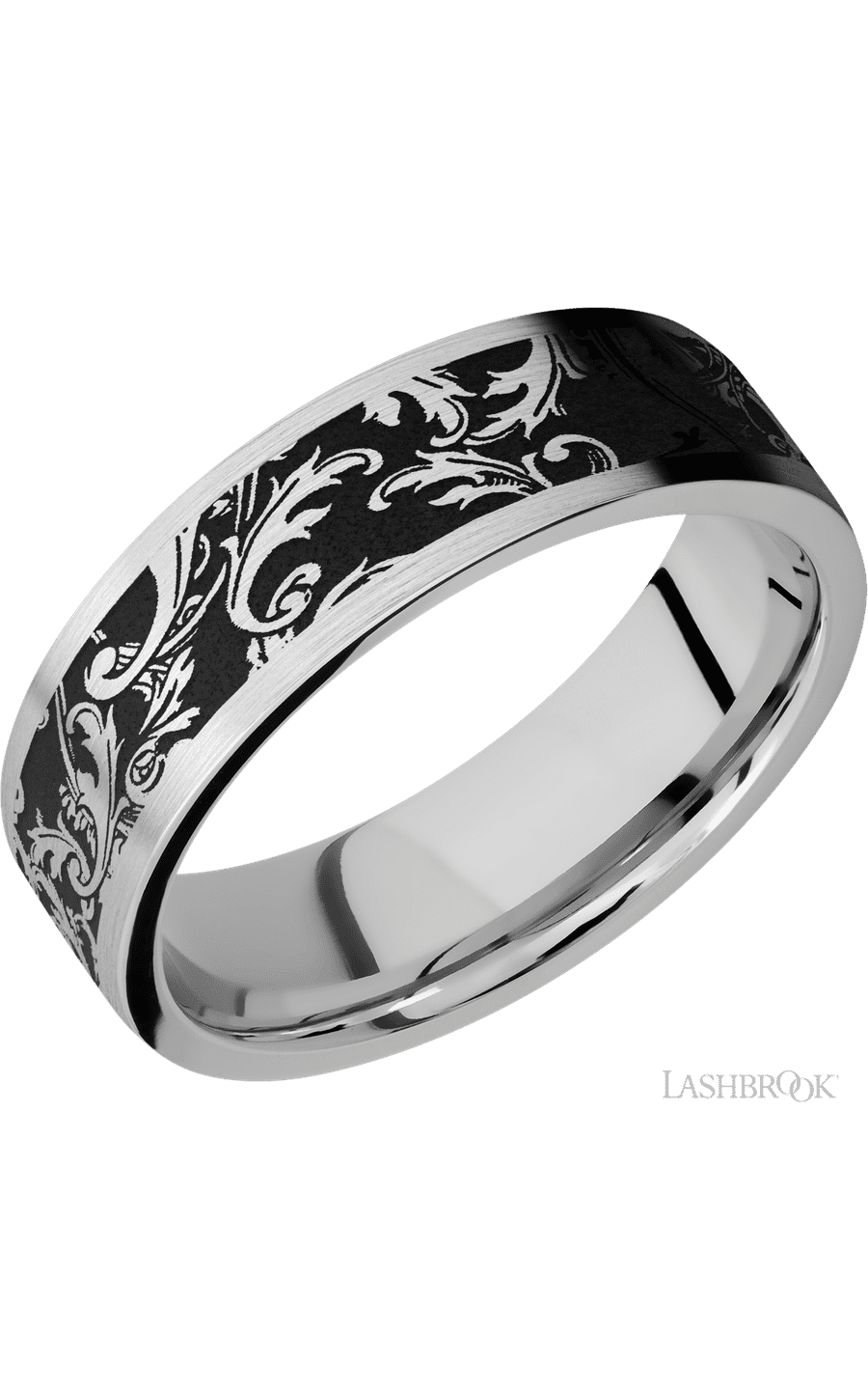 CC7F/LCVBLACKLEAF/A 7 mm wide/Flat/Cobalt Chrome band with a laser carved Black Leaf pattern.