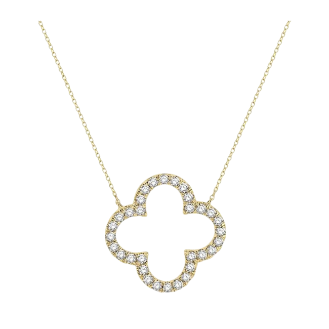 The cloverleaf symbolizes good luck, fortune, happiness, and love. It is therefore popularly used as a charm in jewelry. It can be gifted to anyone whom you wish for good things to happen. This cloverleaf diamond necklace makes for a good choice. It features a clover leaf cutout necklace that is decorated with round-cut diamonds. There is a total of 32 fishtail set round cut diamonds embellishing the clover leaf. A Cat chain holds the clover necklace. The diamond clover necklace is carved in 14 karat yellow gold. Total diamond weight is 1 ctw.