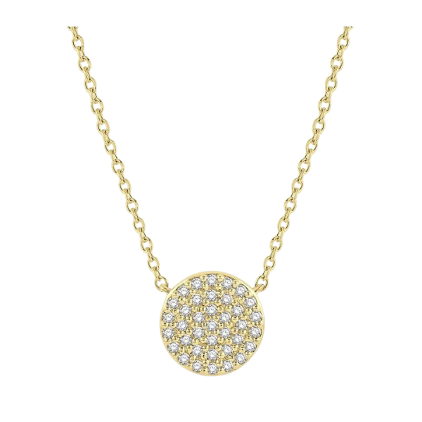 A pretty and stylish disc necklace for your jewelry collection! The necklace makes a good addition to your everyday looks. Although small in size, the solid gold necklace is beautified with round-cut diamonds that fill the entire disc front, giving it an eye-catching look. There is a total of 37 prong set round cut diamonds embellishing the disc necklace. A Cat chain completes the necklace, which is fashioned in a rhodium finish 10 karat yellow gold. Total diamond weight is 1/6 ctw.