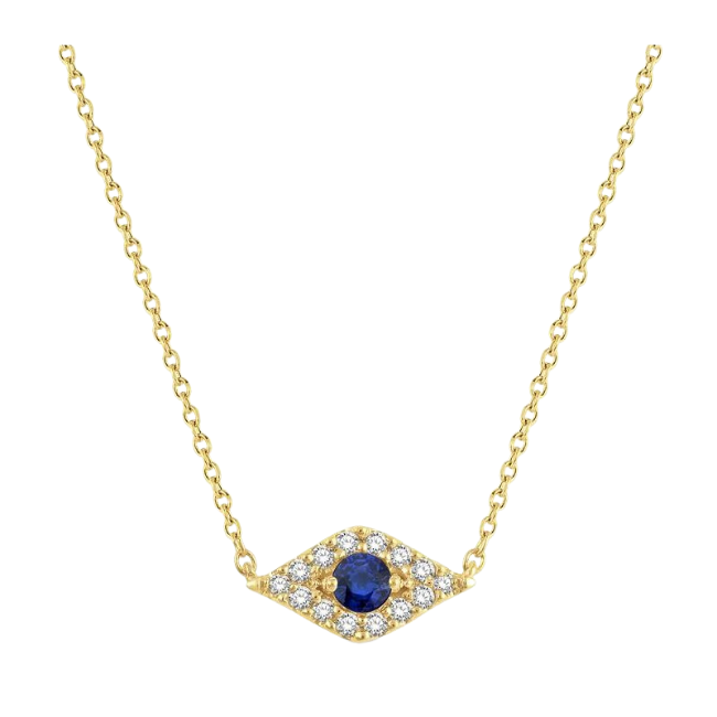 In many cultures, especially in West Asia and the Mediterranean, the evil eye is believed to protect the wearer from bad energies. It is worn in jewelry, so it remains close. Another factor that determines the significance of the evil eye is the color of the stone on it. A deep blue color is the best, as it serves a greater meaning. It signifies motivation, commitment, creativity, and positive energy. If you want one, this evil eye necklace features a deep blue prong set 2.60 MM round cut Sapphire center stone, on an eye-shape necklace. Also, 14 prong set round cut diamonds line the necklace, along the border. Carrying the necklace is a Cat chain, both of which are framed in 10 karat yellow gold. Total diamond weight is 1/10 ctw.