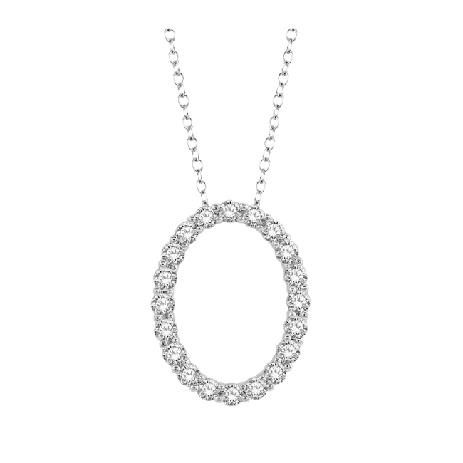 diamond pendants offer sophistication to your ensembles, and they need not be big and showy to be noticed. Even a simple diamond pendant like this one can complement your look. The pendant features an oval shape, with a window center, so, all you see is an oval-shaped border. Round-cut diamonds embellish the oval border. There is a total of 20 prong set round cut diamonds decorating the pendant face. An Box chain attaches to the pendant. Both the chain and the diamond pendant are styled in 14 karat white gold. Total diamond weight is 3/4 ctw.