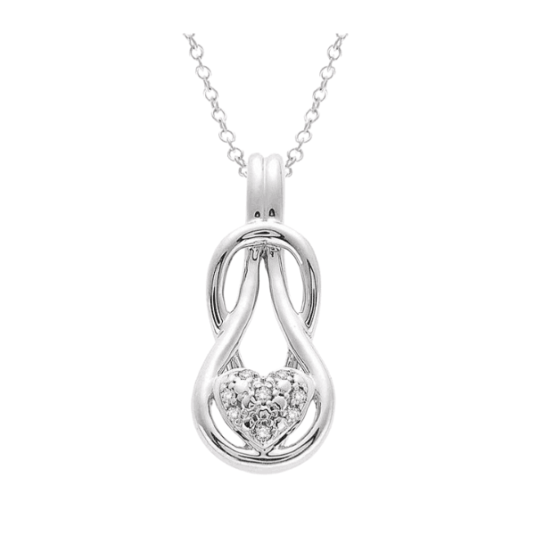 Gift this diamond heart pendant, a perfect expression of true love for her. Styled in fine sterling silver this pendant showcases two tear drop shape interlocked with each other and ornated with 6 prong set single cut inset diamonds in heart motif. The pendant hangs from a beautiful sterling silver Cable chain. Total diamond weight is 1/50 ctw.
