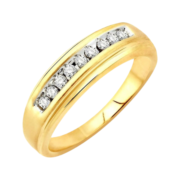 Add an elegant sparkle to your wedding day with this exquisite diamond men's ring delicately crafted in 14 karat lustrous yellow gold in satin finish featuring 9 scintillating round diamonds in nick set. For a timeless symbol of your love and happiness. Total diamond weight is 1/6 ctw.