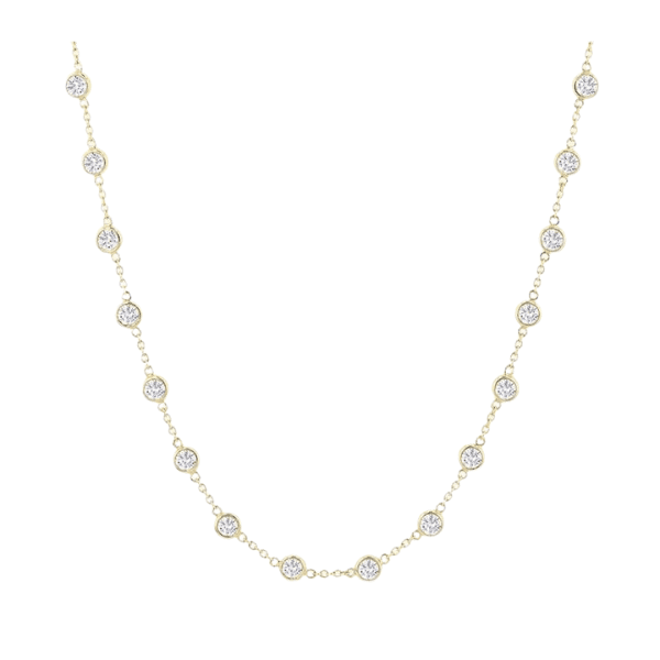 • Details: 5 ctw Bezel Set Round Cut Diamond Station Necklace in 14K Yellow Gold