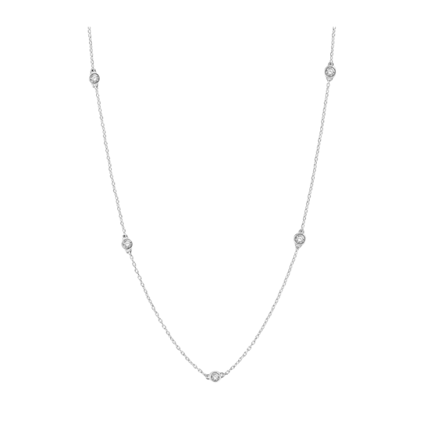 A delicate gold station necklace with diamond studs offering it an elegant touch. This pretty necklace can be worn by itself or with other accompaniments that you may choose to wear. It features 11 bezel set round cut diamonds that are placed at certain intervals around the link chain, to give it an even better and wholesome look. The cat link chain that makes the base of the necklace has a standard length of 18 inches. The charming diamond necklace is designed in 14 karat white gold. Total diamond weight is 3/4 ctw.
