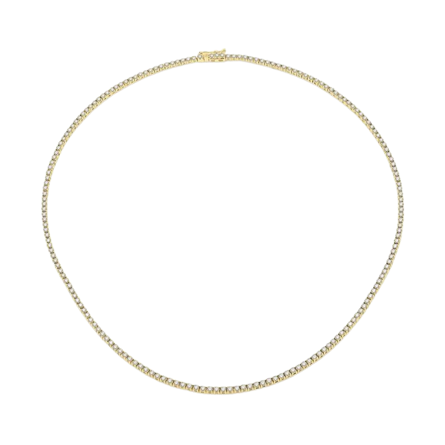 A grand diamond tennis necklace, this makes for the perfect anniversary or milestone occasion gift. It features a full row of diamonds that line the necklace from one end to the other, giving it a stunning luminous look. Any woman who receives this sparkling diamond necklace, will be elated with the gift. The necklace is embellished with 170 prong set round cut diamonds. A lobster clasp secures the tennis necklace, which is crafted in 14 karat yellow gold. Total diamond weight is 5 ctw.