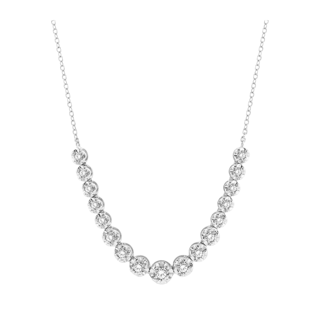 An elegant diamond illusion necklace, this lends beauty and sophistication to your ensembles. A perfect choice for special occasion gifting, this necklace gets instant attention. It features 17 round mounts, closely placed side by side, along the neckline, with an 18-inch cat chain completing the look. The central mount is larger than the other mounts, which decline slightly in size as they ascend towards the link chain. Each of the round mounts is embellished with a prong set round cut diamond, a total of 17 on all mounts together. The diamond illusion necklace is fashioned in a polished rhodium finish 14 karat white gold. Total diamond weight is 1 ctw.