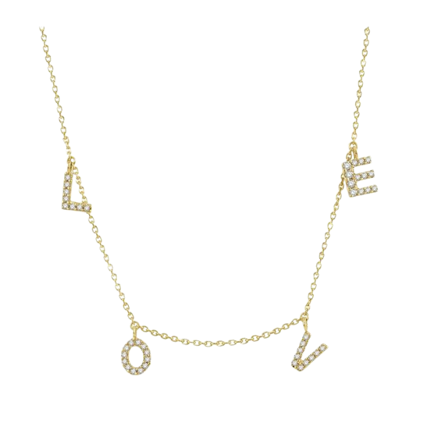 What better way to show your beloved or a loved one your love for them, than a necklace that says it all. This station necklace features the word 'LOVE', wherein the letters are spaced between link chains. The design for station necklaces requires charms or letters, or any other similar decorations to be placed at certain intervals, between small breaks in the link chain as it goes along. The four letters 'LOVE' are decorated with diamonds and can be seen along the neckline. 43 micro wall set round cut diamonds embellish the letters altogether. The station necklace is an 18-inch CAT25 cat chain, styled in 14 karat yellow gold. Total diamond weight is 1/6 ctw.