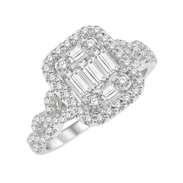 An adroitly carved and assembled fusion diamond ring, this makes an elite addition to the jewelry box. It features a fine combination of baguette and round cut diamonds. A 1/6 ct baguette diamond nestles on the center mount, and is flanked by a 1/10 ct baguette diamond on the side and a 1/20 ct baguette diamond at the top and bottom. 4 prong set round cut diamonds fill the corners of the mount. A lower outer mount, which borders the center mount, is embellished with 24 prong set round cut diamonds. An entwined shank, with 20 prong set round cut diamonds each on either side, lends to the gorgeous look of this fusion ring, which is styled in 14 karat white gold. Total diamond weight is 1 ctw.