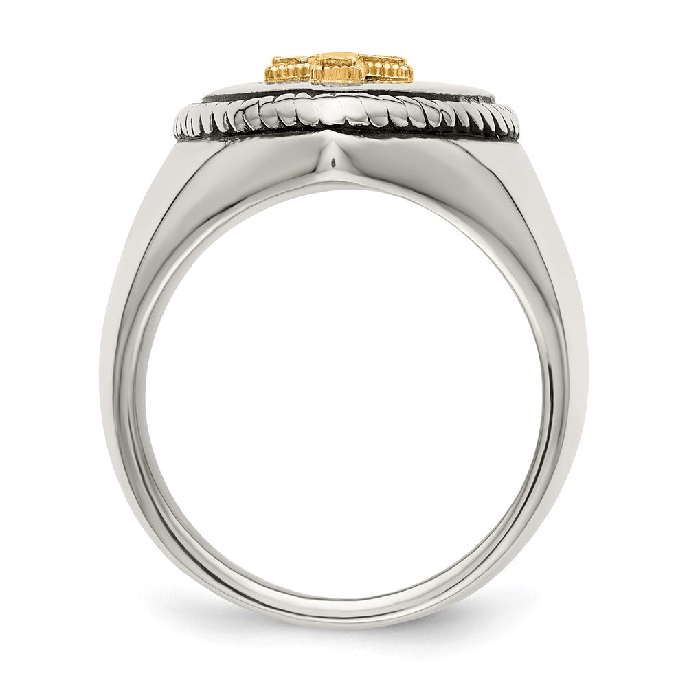 Chisel Stainless Steel with 14k Gold Accent Antiqued and Polished Cross on Shield Ring