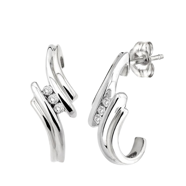 Gorgeous diamond earrings add both elegance and contemporary style to any look. These designer earrings are bejeweled with the sparkle of 6 exquisite round cut diamonds in channel set. These treats closes with a earnut back. The earrings is styled in sterling silver. Total diamond weight is 1/10 ctw.