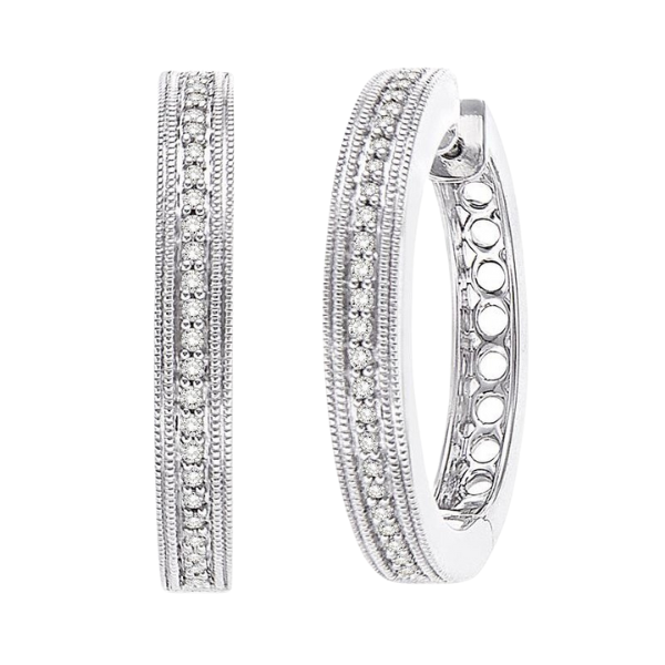 Pure elegance for her matchless beauty, these captivating milgrain finished diamond hoop earrings fashioned in glinting sterling silver. The enchanting design of these lovelies sparkles with the radiance of 48 sizzling single cut diamonds beautifully set in prong set. Total diamond weight is 1/4 ctw.