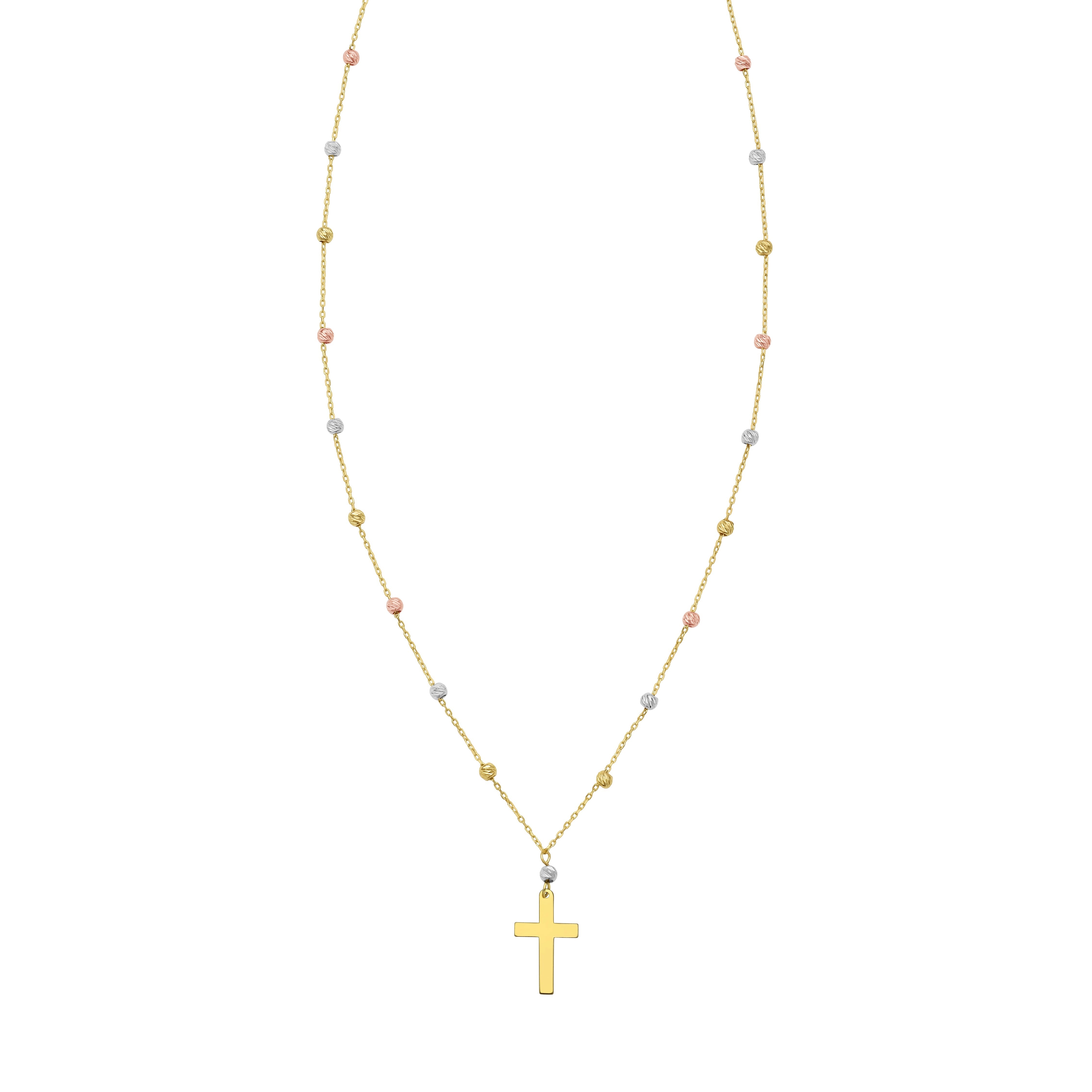 14K Tri-color Gold Beaded Chain Polished Cross Necklace with Spring Ring Clasp Including 2" Extender