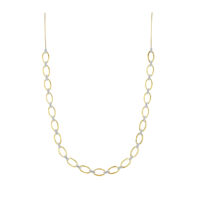 Open links offer a stunning finish to a piece of jewelry, especially the ones that come with bigger and bolder open links, such as this open link diamond necklace. It features uniform oval shaped open links that connect via diamond embellished connectors, which further enhance the beauty of the necklace. Each of the 21 connectors is embellished with 8 each prong set round cut diamonds, total 176 diamonds. A 1.50MM wheat chain and lobster clasp closure complete the open link diamond necklace, which is fashioned in 14 karat yellow gold. Total diamond weight is 1 ctw.