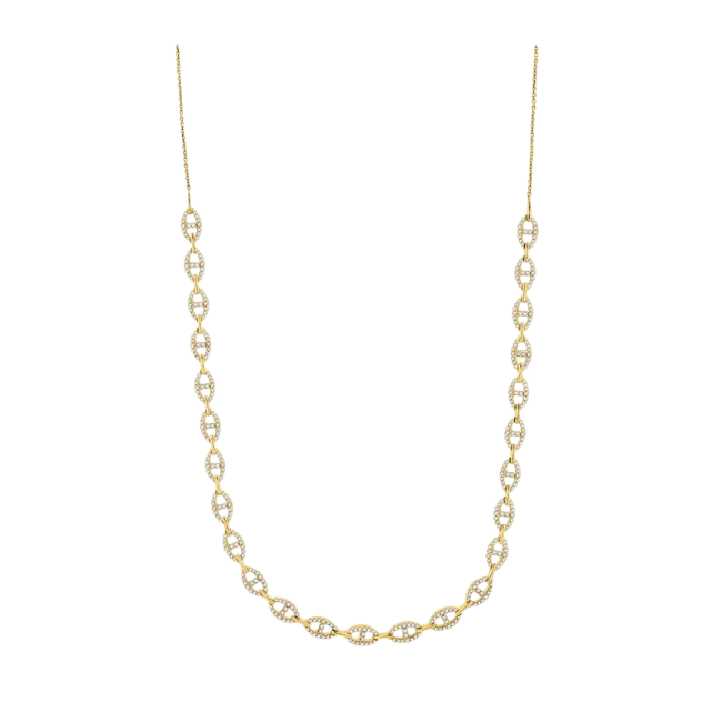 Make a style statement with open link jewelry, as these offer a splendid look to your outfits. This glamorous open link diamond necklace for example is a great buy, with its large links and generous diamond embellishment. The necklace features diamond accented oval shaped open links, connecting via plain gold connectors that add to the gorgeous look of the necklace. Each of the 25 open links is embellished with 16 each prong set round cut diamonds, total 400 diamonds. A 1-inch 1.50MM wheat chain and lobster clasp complete the necklace, which is crafted in 14 karat yellow gold. Total diamond weight is 1 1/2 ctw.