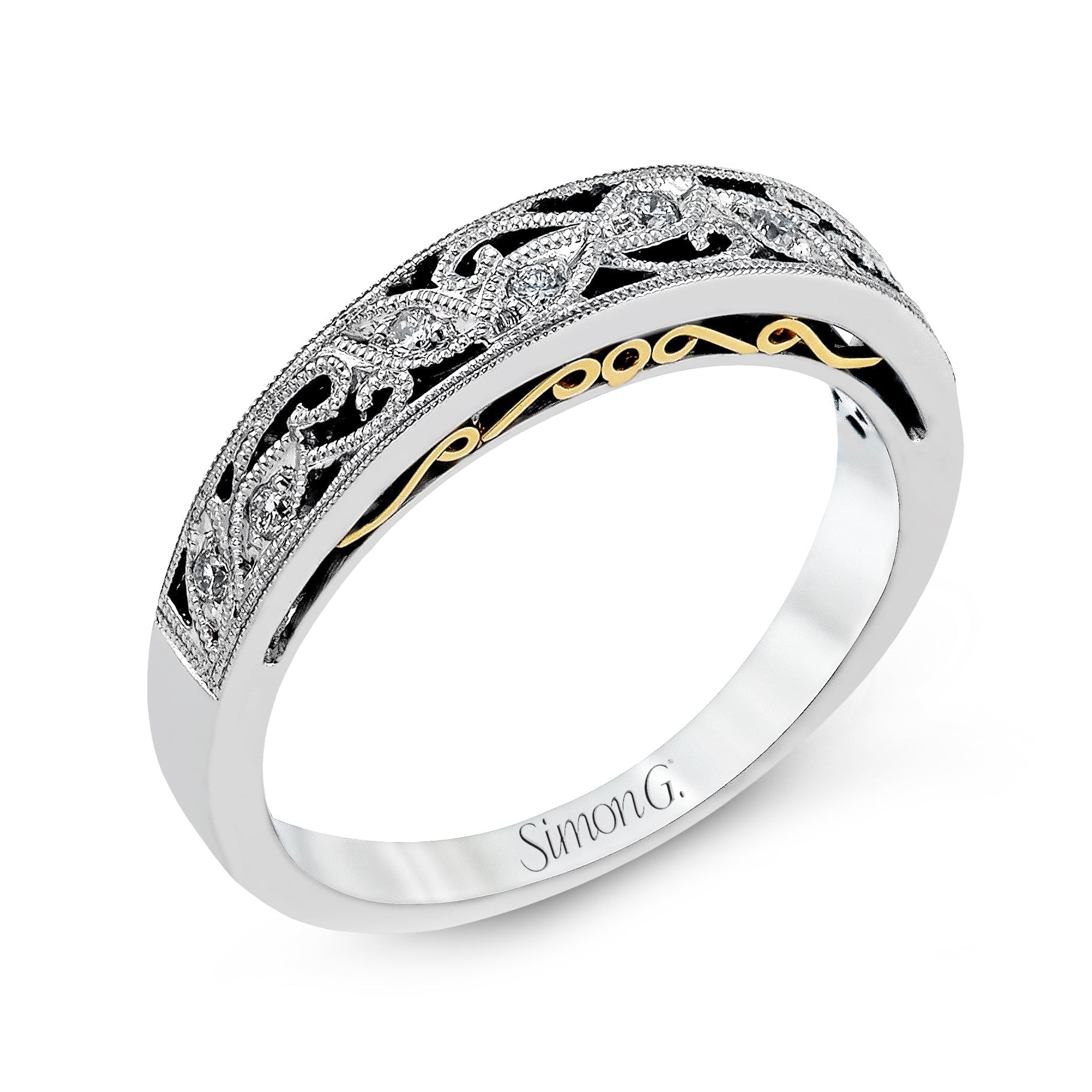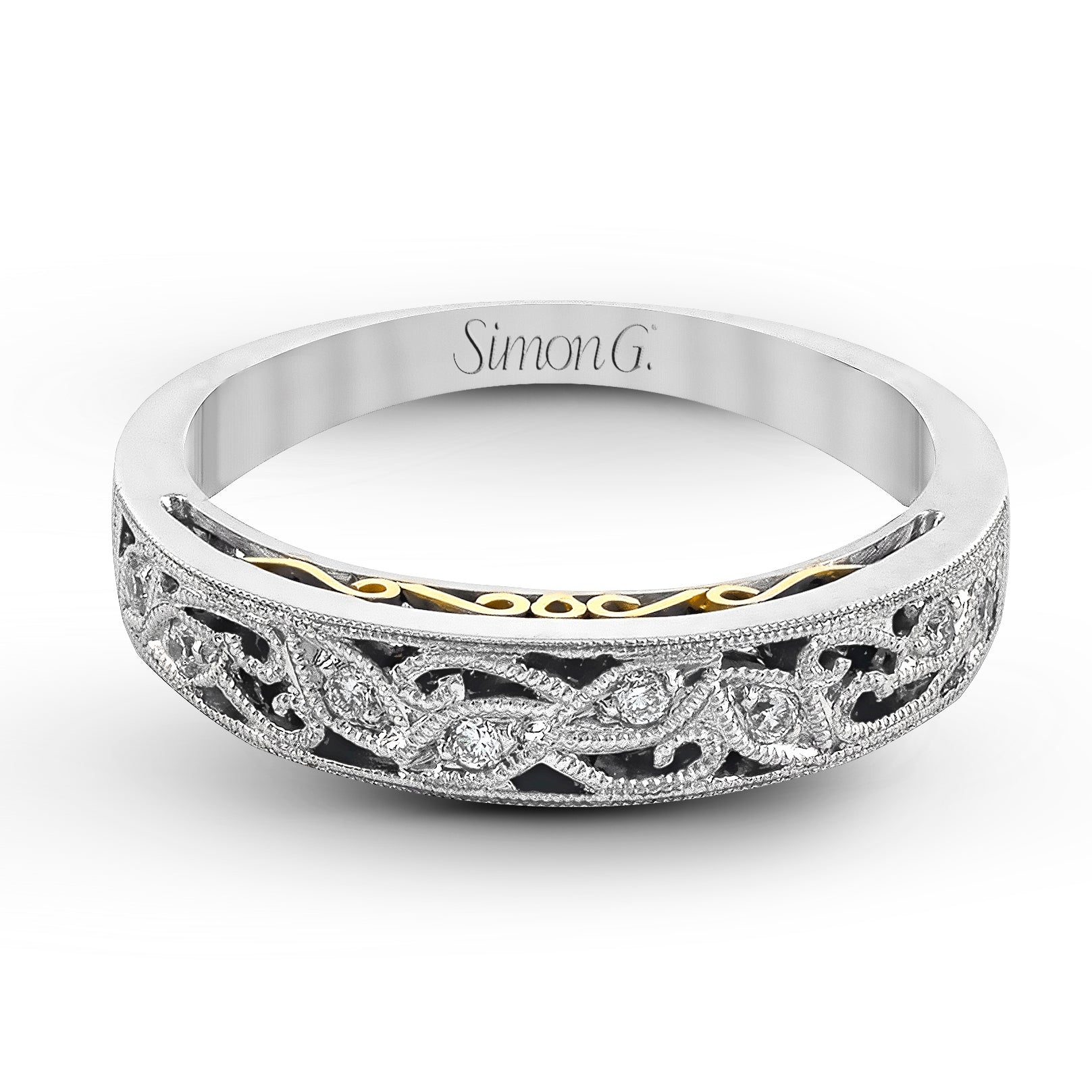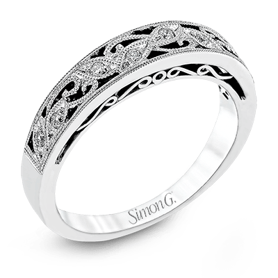 This delicate band features an intricate vintage design set with sparkling white diamonds.