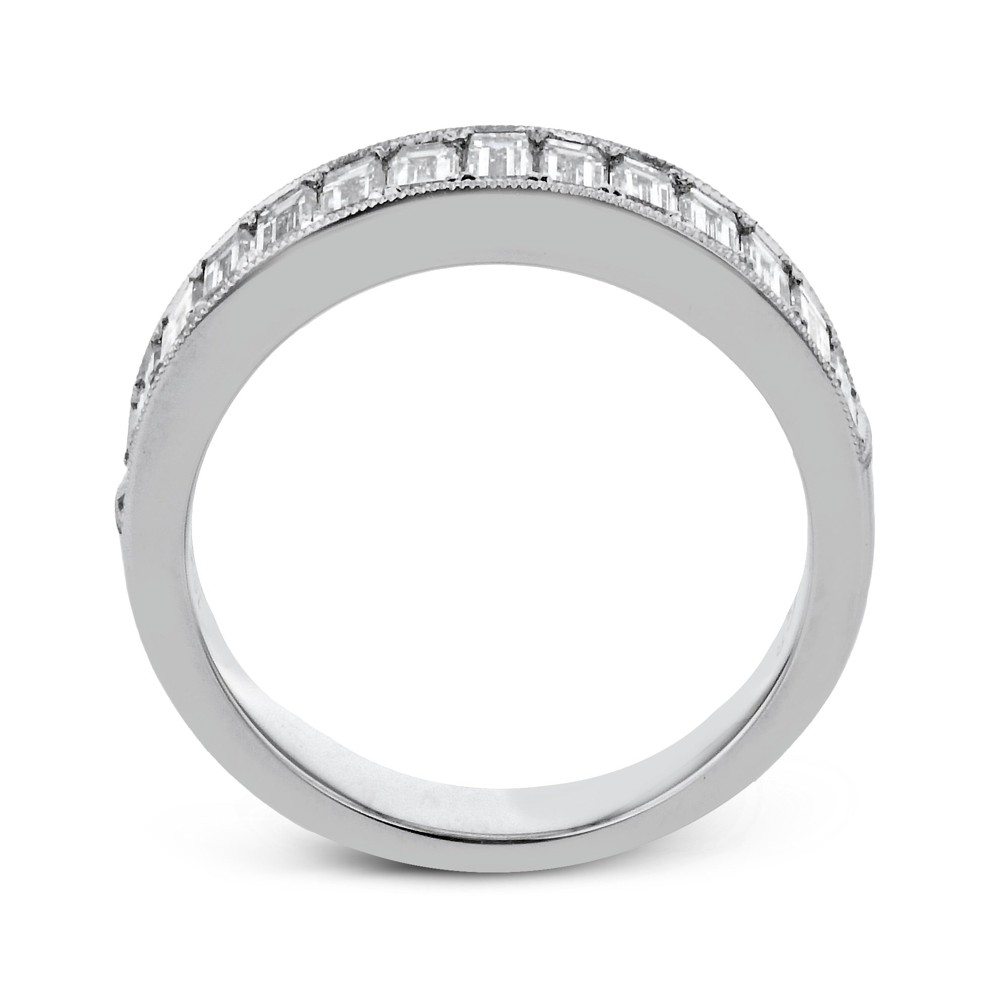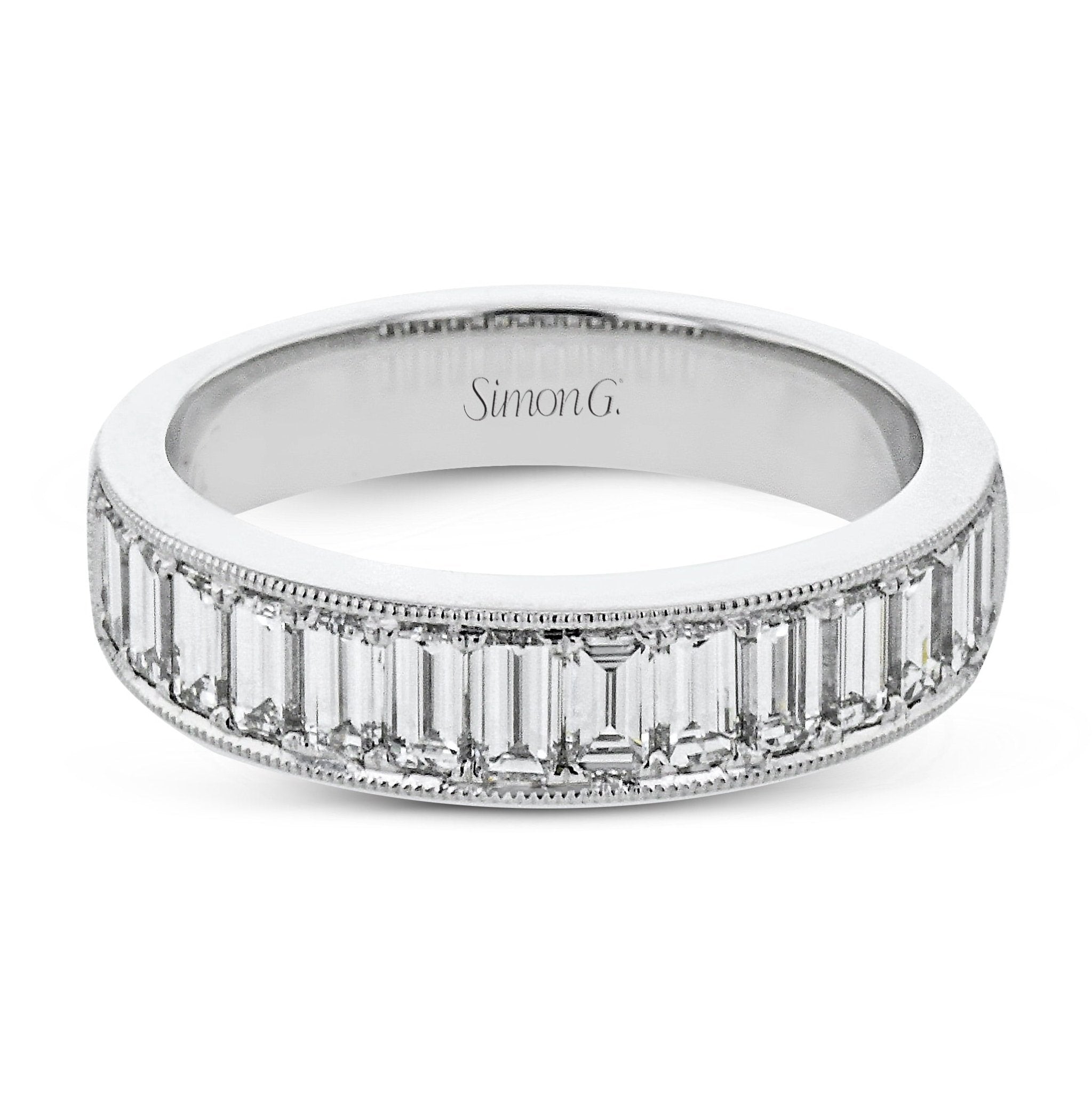 This sleek anniversary band is crafted with our patented Simon-set design technique and features brilliant baguette diamonds with a delicate milgrain edge.