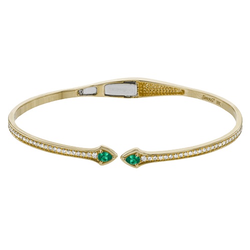 This modern, hinged bangle adds a touch of color with two blue sapphire accents and is set with brilliant diamonds along the sides.