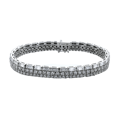 This bold bracelet is sure to turn heads with its elaborate design, which features a combination of sparkling round and baguette diamonds.
