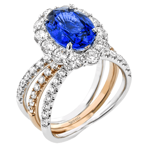 18k white and rose gold split shank ring with an oval sapphire 3.4 ct. center, and 1.81 ctw. of diamonds in the halo and on the bands