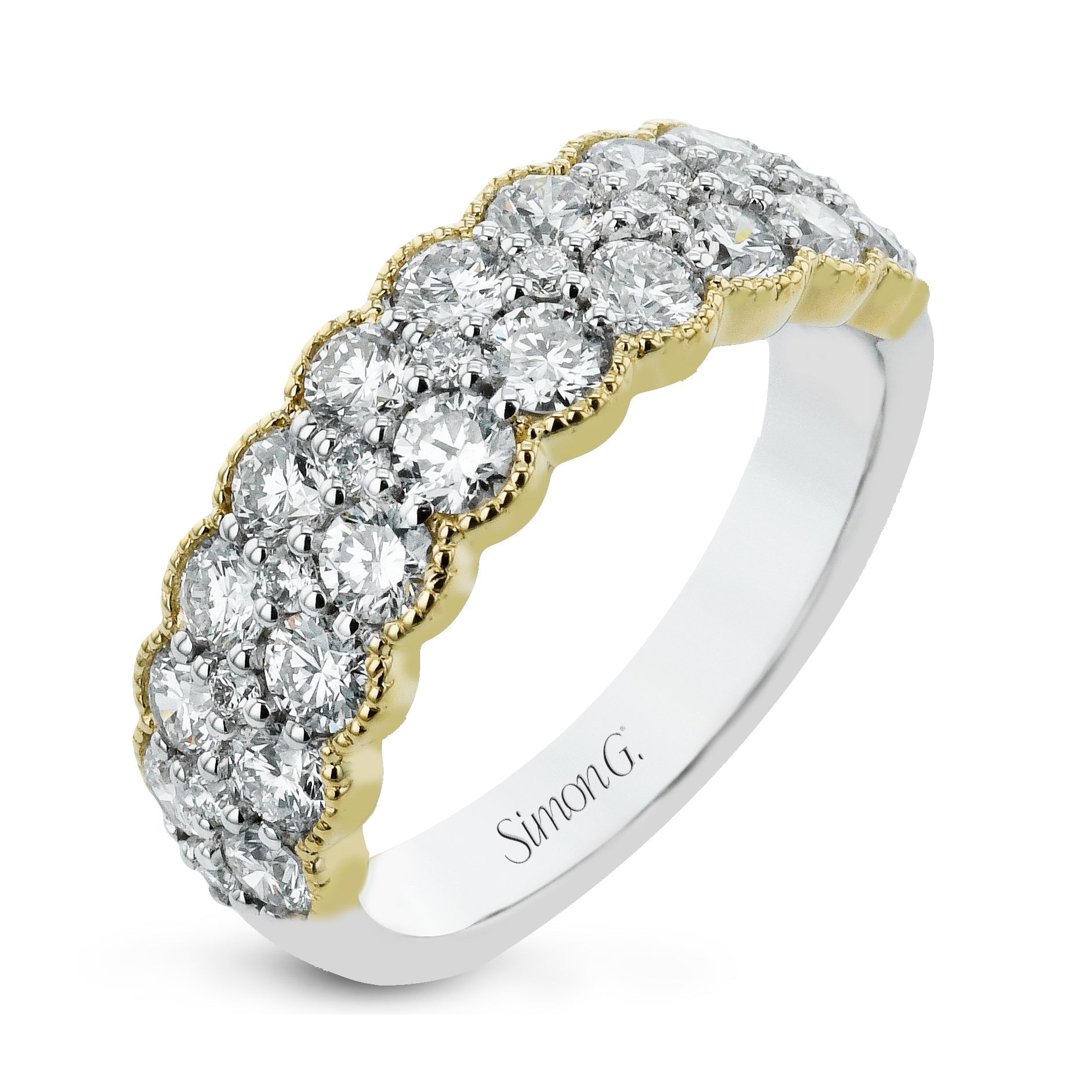 This stunning ring features a two-tone design adorned with two rows of shimmering diamonds.