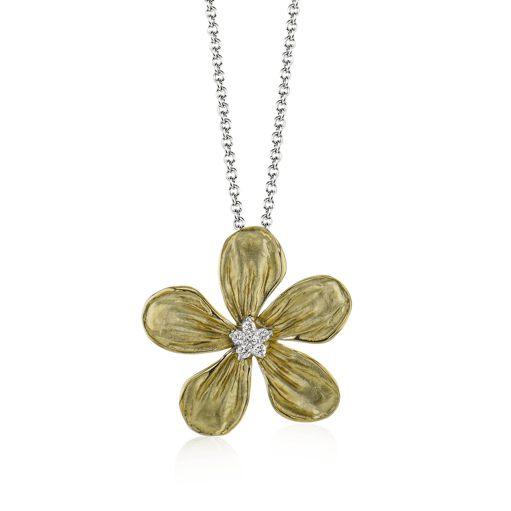 This two-tone textured flower pendant features a sparkling cluster of white diamonds in its center and rests on a white gold chain.