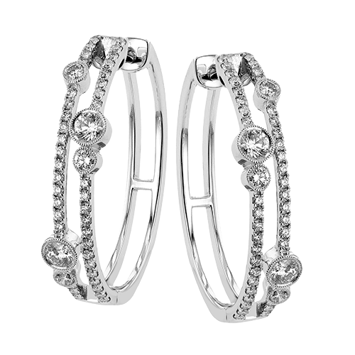 These whimsical diamond hoops feature a distinctive design with larger, bezel-set diamonds nestled between smaller, sparkling diamonds.