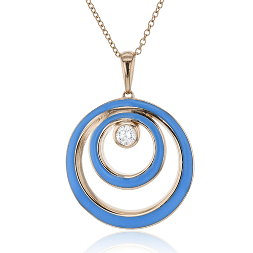 This distinctive pendant features a concentric design and is crafted with enamel and sparkling diamonds.