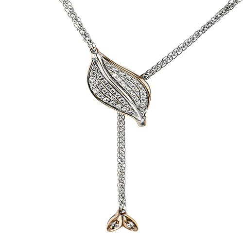 This lovely lariat necklace features a leaf design set with glimmering white diamonds.