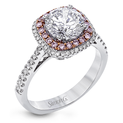 This beautiful ring features a double-halo design and is adorned with sparkling white and pink diamonds.