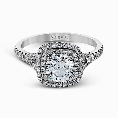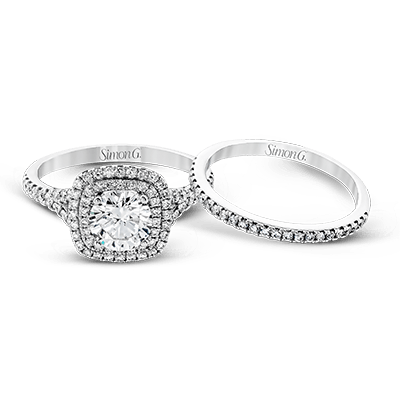 This stunning, contemporary wedding set features an impressive halo accented by sparkling white diamonds.