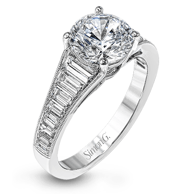 This gorgeous engagement ring features brilliant baguette diamonds leading to the center stone and an outside edge intricately decorated with delicate milgrain.