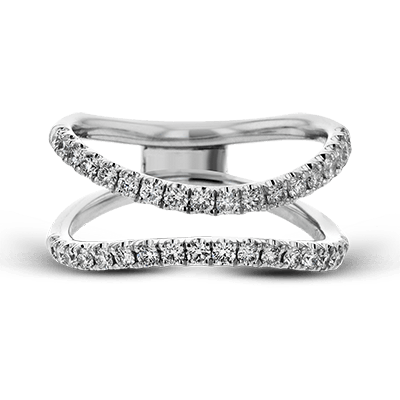 This distinctive bridal set design offers a double-layer wedding band that fits around the engagement ring and is set with brilliant white diamonds.