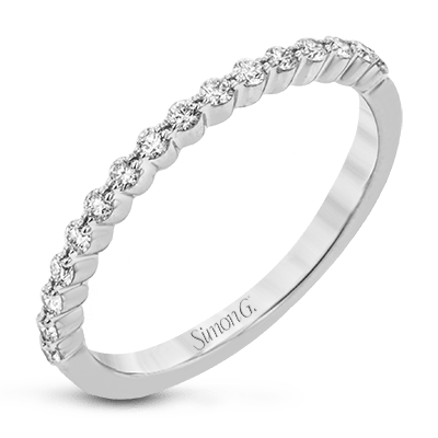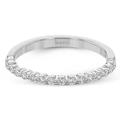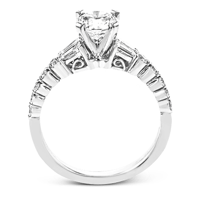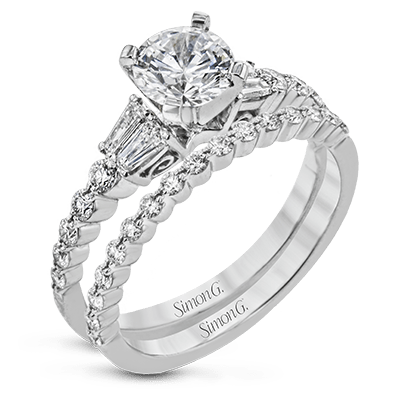 This wedding set stands apart with a unique design featuring two tapered baguette diamonds on either side of the center stone, as well as sparkling white accent diamonds.
