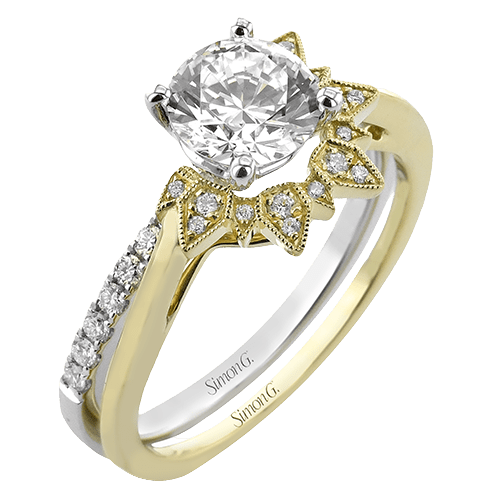This beautiful, two-tone wedding set pairs a floral-inspired yellow gold wedding band with a white gold engagement ring and is adorned brilliant diamonds.