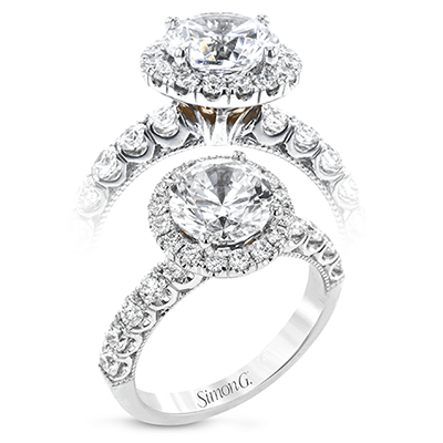 This stunning halo engagement ring absolutely dazzles with sparkling round white diamonds.
