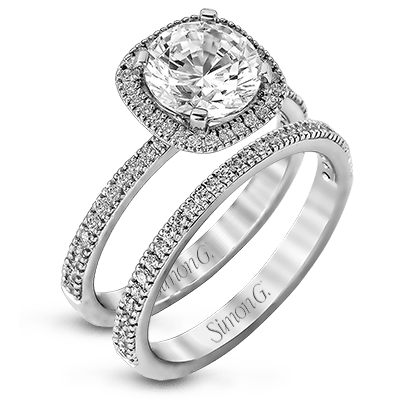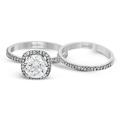 This striking wedding set features a contemporary take on vintage style and is adorned with sparkling white diamonds.