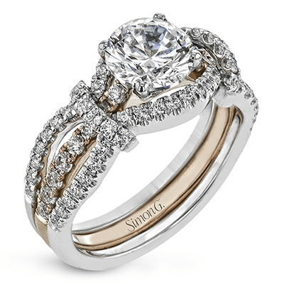 This stunning wedding set features a unique, modern design and is accented with shimmering white diamonds.