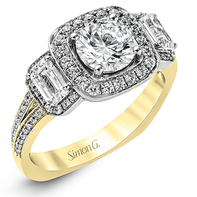 This impressive engagement ring features a halo design along with brilliant emerald side diamonds and sparkling round diamonds.