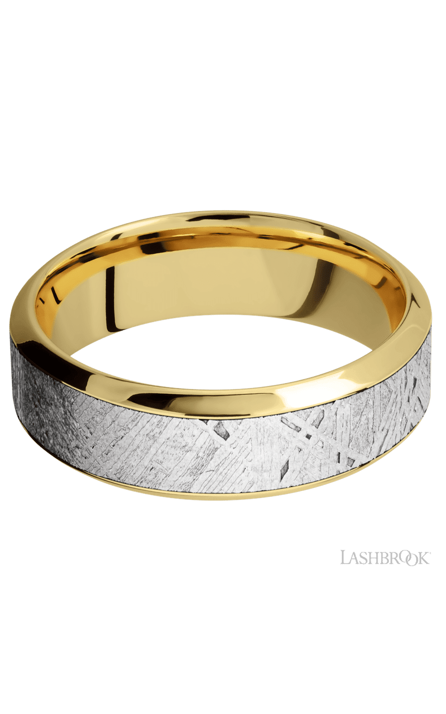 7 mm wide/High Bevel/18K Yellow Gold band with one 4 mm Centered inlay of Meteorite.